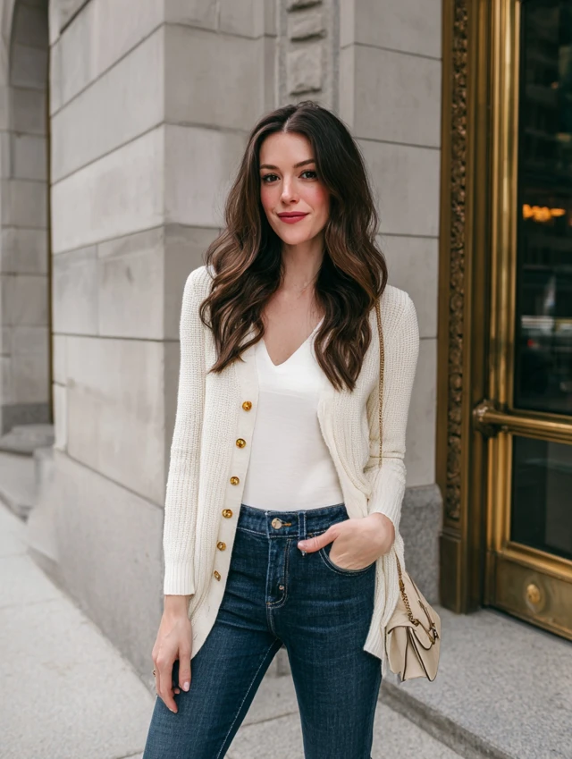 1. Classic Neutral Cardigan + White Tee + Jeans