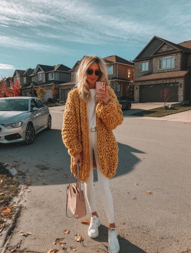 - Neutral base, bold cardigan: Let a colorful or patterned knit be the star.