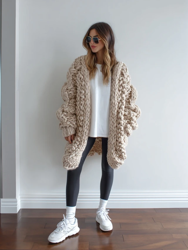 4. Chunky Knit Cardigan + Leggings + Sneakers