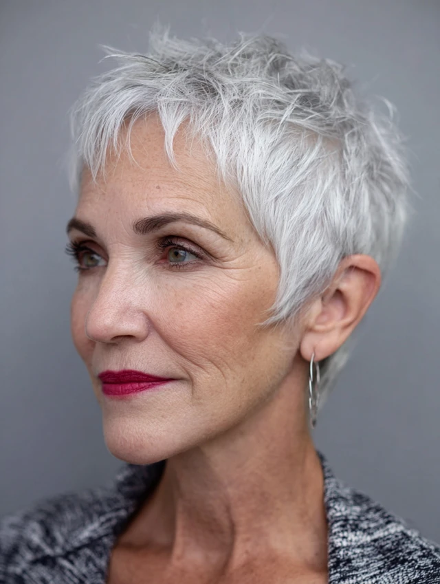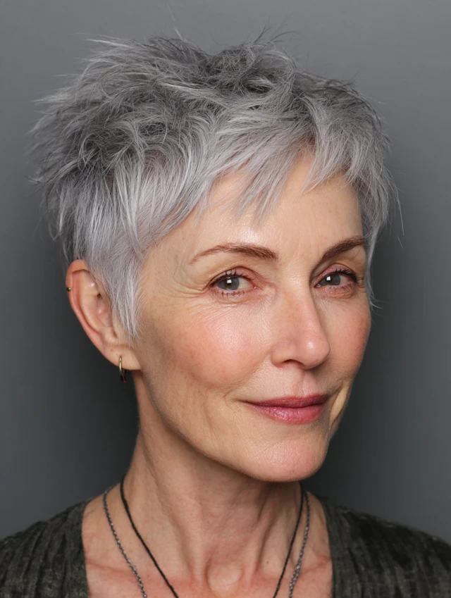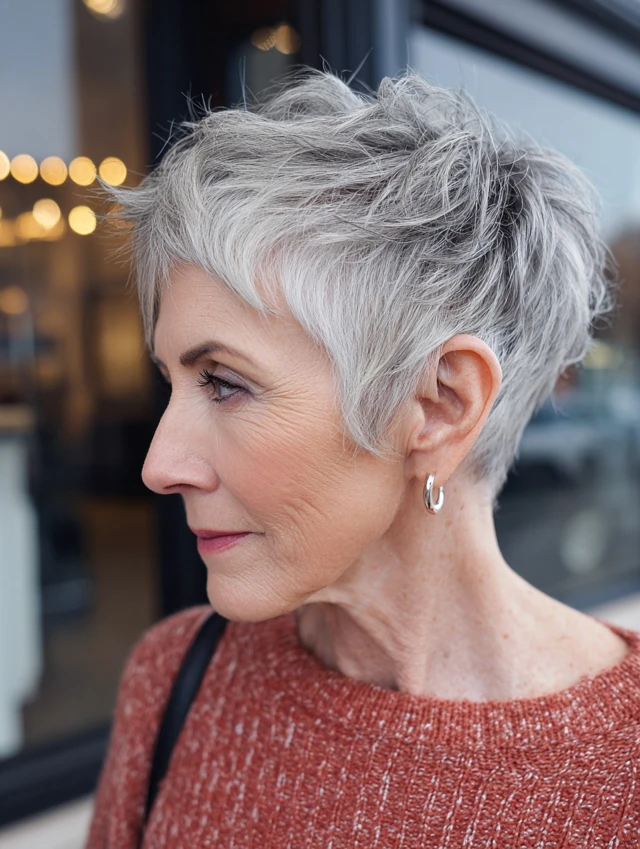 Edgy choppy pixie haircuts over 50 are bold, flattering, and empowering. Whether tousled, side-swept, or paired with natural gray, this haircut celebrates confidence, individuality, and modern beauty.