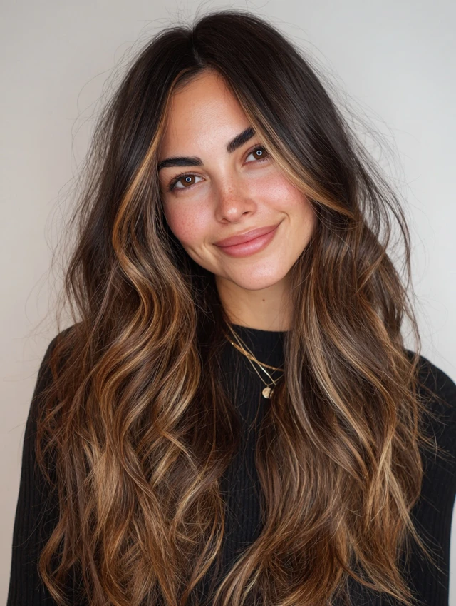 Caramel tones add warmth and brightness while blending beautifully into brunette hair.
