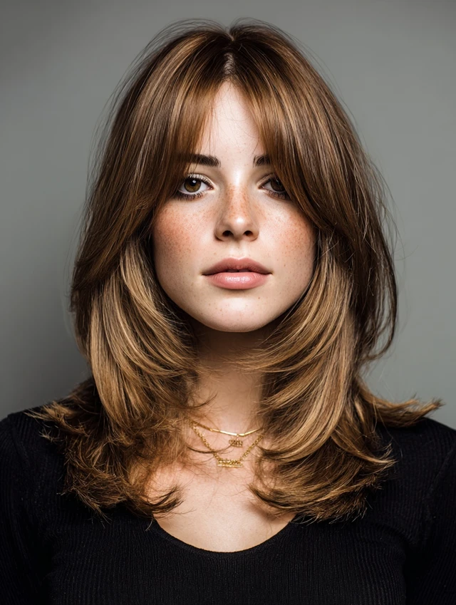 Curtain layers frame the face symmetrically, adding softness and volume.