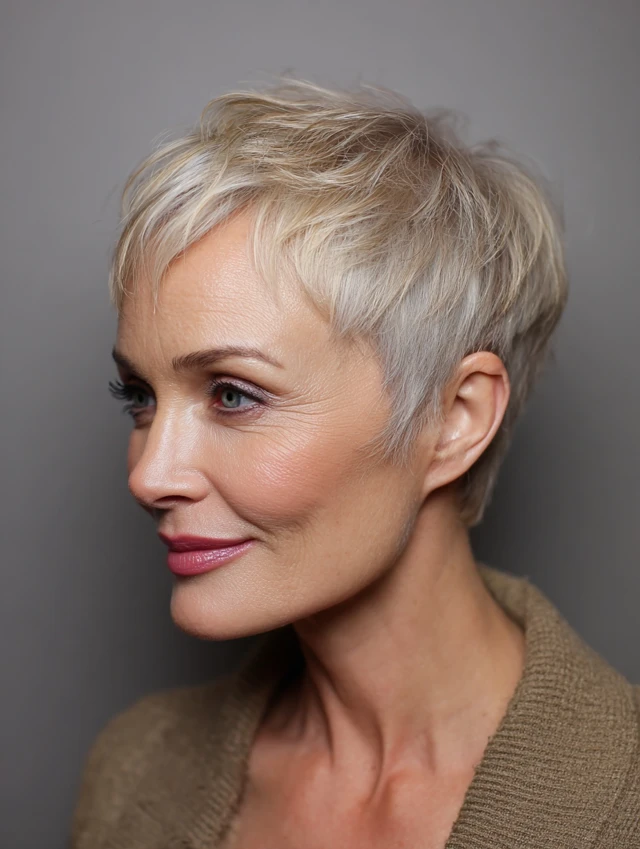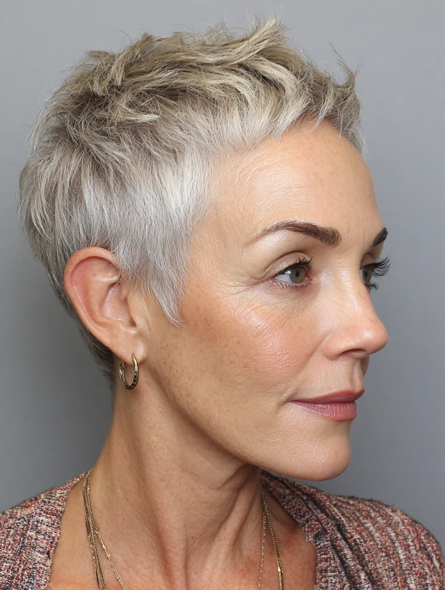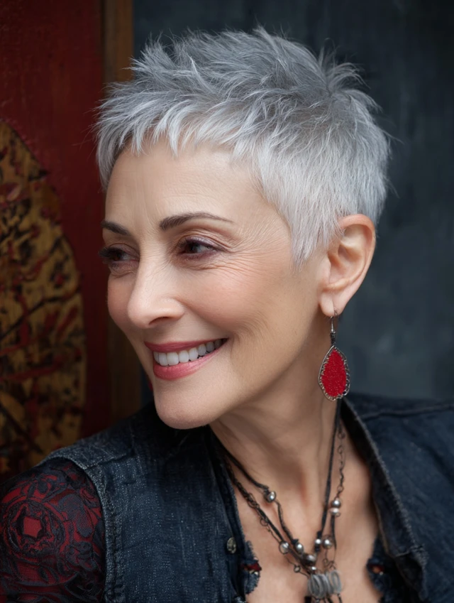 A pixie cut highlights facial features and turns salt and pepper color into a bold statement.