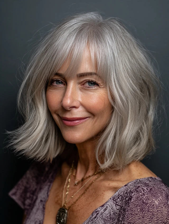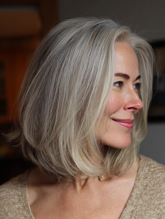 The lob feels modern and balanced, perfect for showcasing salt and pepper tones.