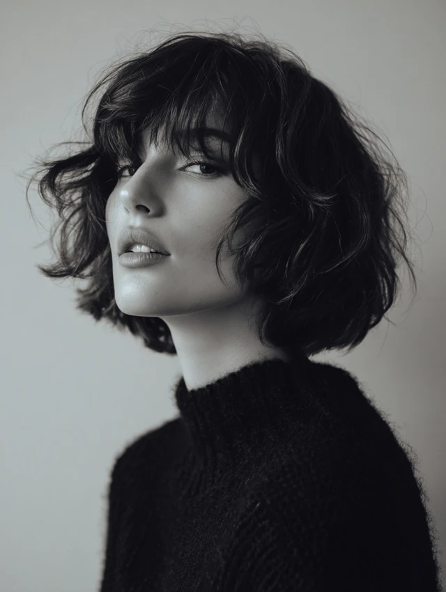 Soft layers frame the face and highlight natural features.
