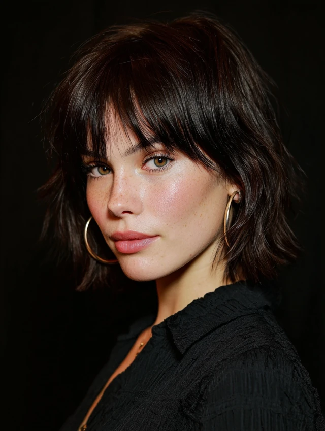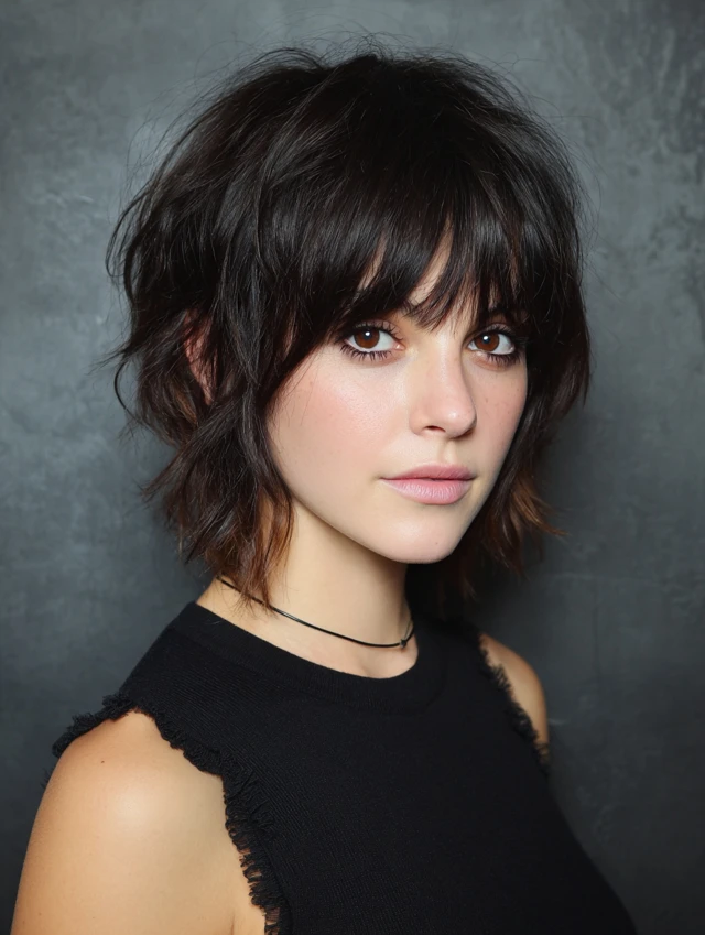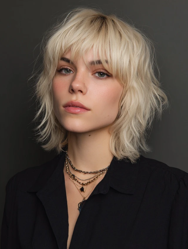 Wispy bangs soften the face while shaggy layers add movement.