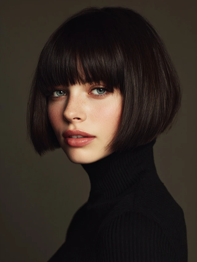 Blunt bangs with angled layers create structure and add volume for a flattering silhouette.