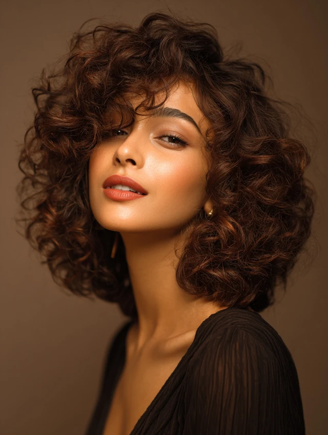 Side-swept bangs integrate naturally with curls and create a soft, flattering frame.