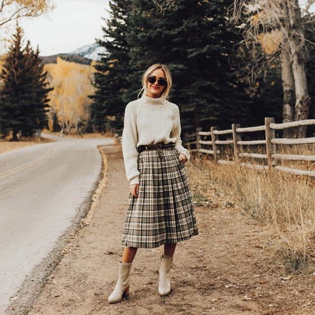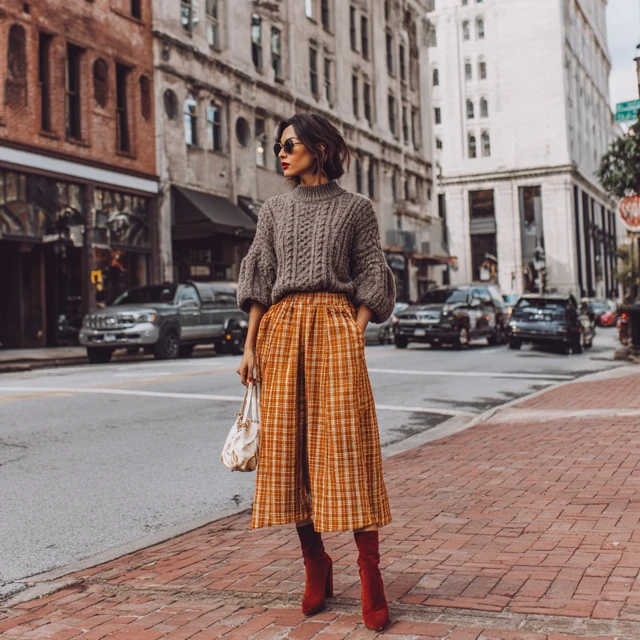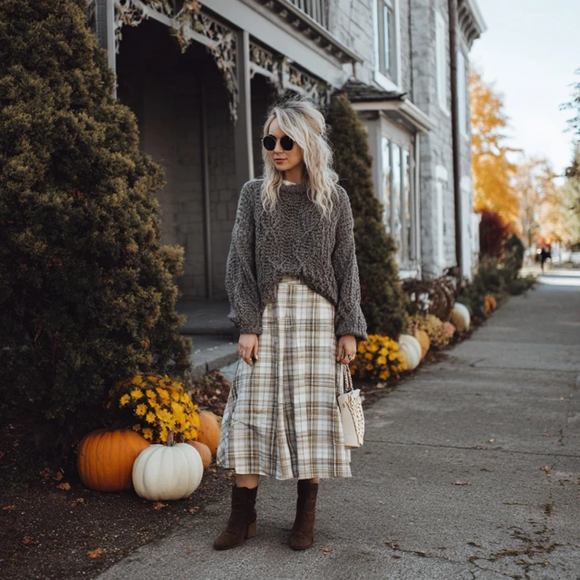 Why It Works: Nothing says fall like plaid. A midi skirt allows comfort while a chunky knit sweater keeps things festive yet relaxed.