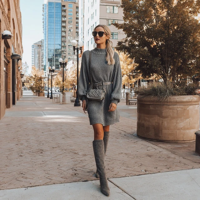 Why It Works: A sweater dress combines cozy comfort with chic polish. Boots elongate your legs and balance the relaxed fit.