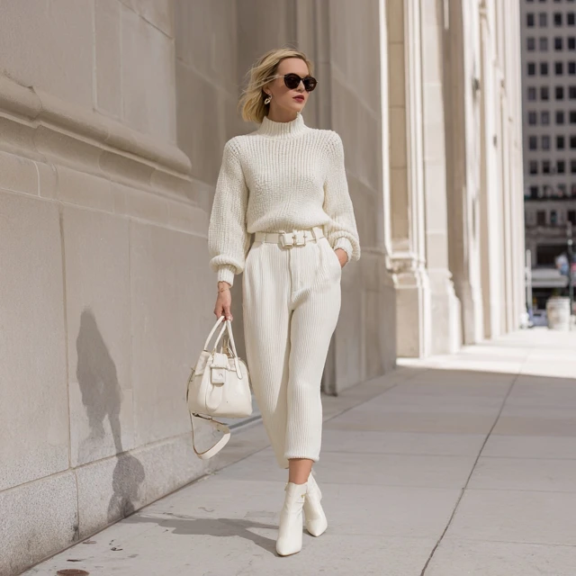 Why It Works: Head-to-toe knitwear is both stylish and comfortable. The monochrome look elongates and adds effortless polish.
