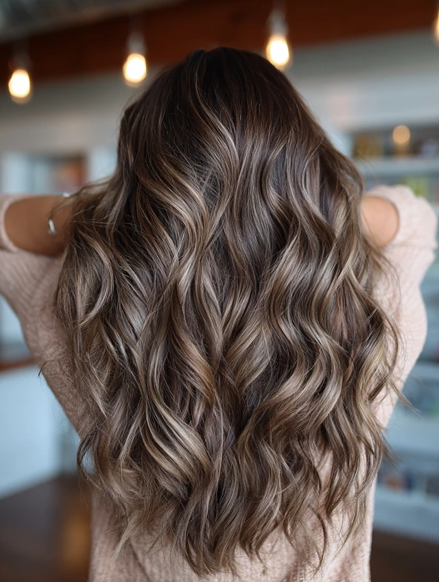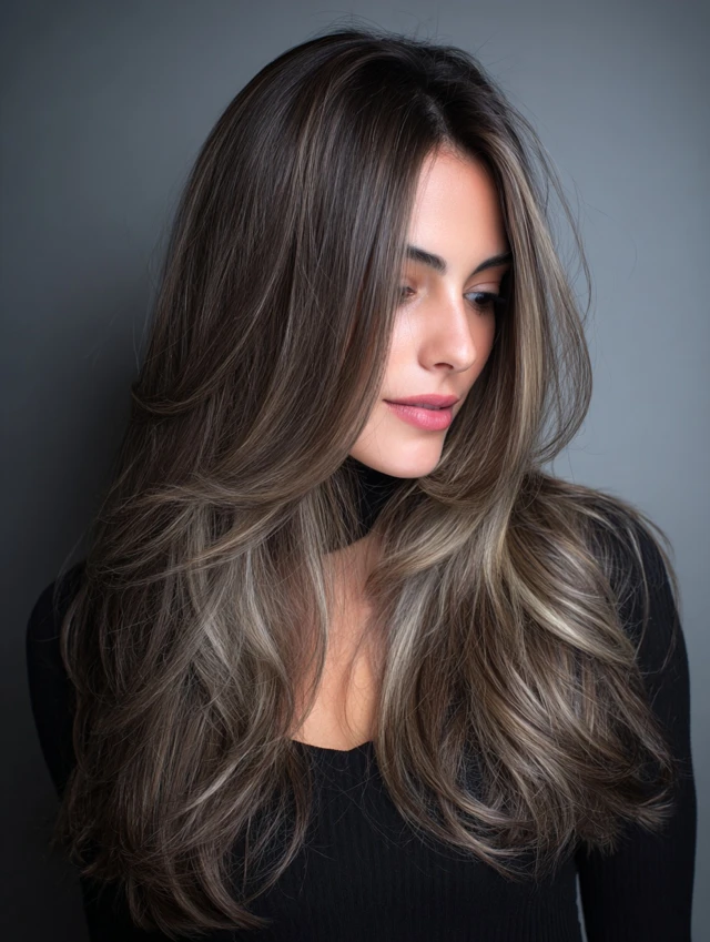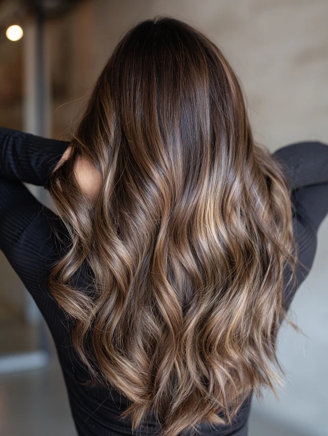 Cool-toned balayage gives brunettes a modern, winter-ready edge.